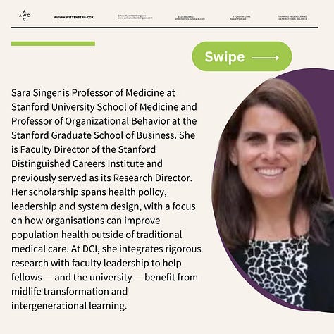 This week she welcomes Sara Singer, Faculty Director of the Stanford Distinguished Careers Institute (DCI), to discuss how midlife transition programmes are reshaping universities — and the lives of the people who join them. A leading voice on health policy, organisational behaviour, and system design, Sara has brought a research lens to DCI, measuring its impact on purpose, community, and wellness.