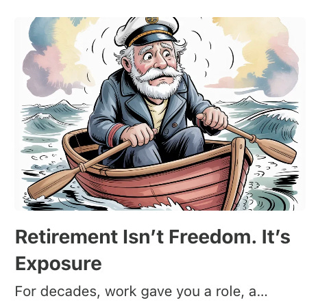 Strip away the naval persona and the money-making guides, and he returns again and again to that same ache. He sounds like a lot of the men I know and coach. Hit by retirement, unaccompanied on the transition, and totally unprepared. He writes about waking up without a mission. About the disorientation of no longer being needed in the same way. About the subtle shift in couple dynamics: the man adrift, his wife still purposeful, still moving, still engaged.