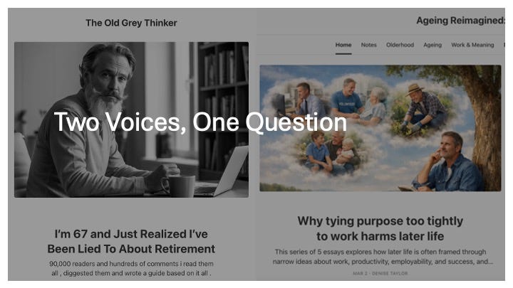 The other is written by Denise Taylor, under her own name, at Ageing Reimagined. She has fewer than 2,000 subscribers. She writes (a bit) less often. Slower. Thoughtfully. She is stepping into her late 60s and has chosen to stop working for money after 52 years of doing exactly that.