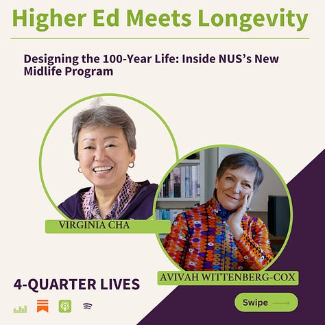 Virginia shares why she launched this 13-week, executive-level program—rooted in longevity literacy, purpose, and impact—designed specifically for adults navigating their 3rd Quarter of life. She describes Singapore’s demographic pressures, the untapped “third demographic dividend,” and why midlife talent represents one of Asia’s most powerful yet overlooked assets. She and Avivah discuss the program’s unique structure: curated seminars across philosophy, religion, culture, arts, and science; a signature module, Thriving in the 100-Year Life; and team-based impact projects.